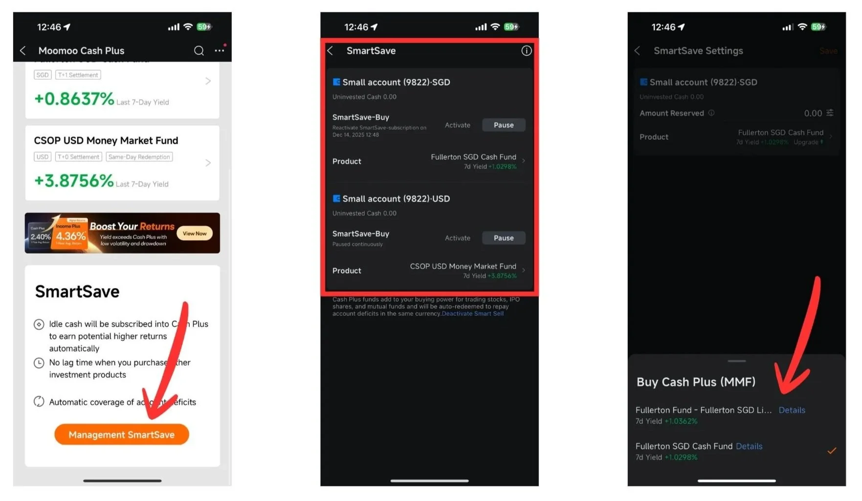 What SmartSave does is move your uninvested cash into CashPlus. This enables you to earn some interest daily, and when you purchase shares in the respective currencies, it will automatically redeem them from CashPlus.