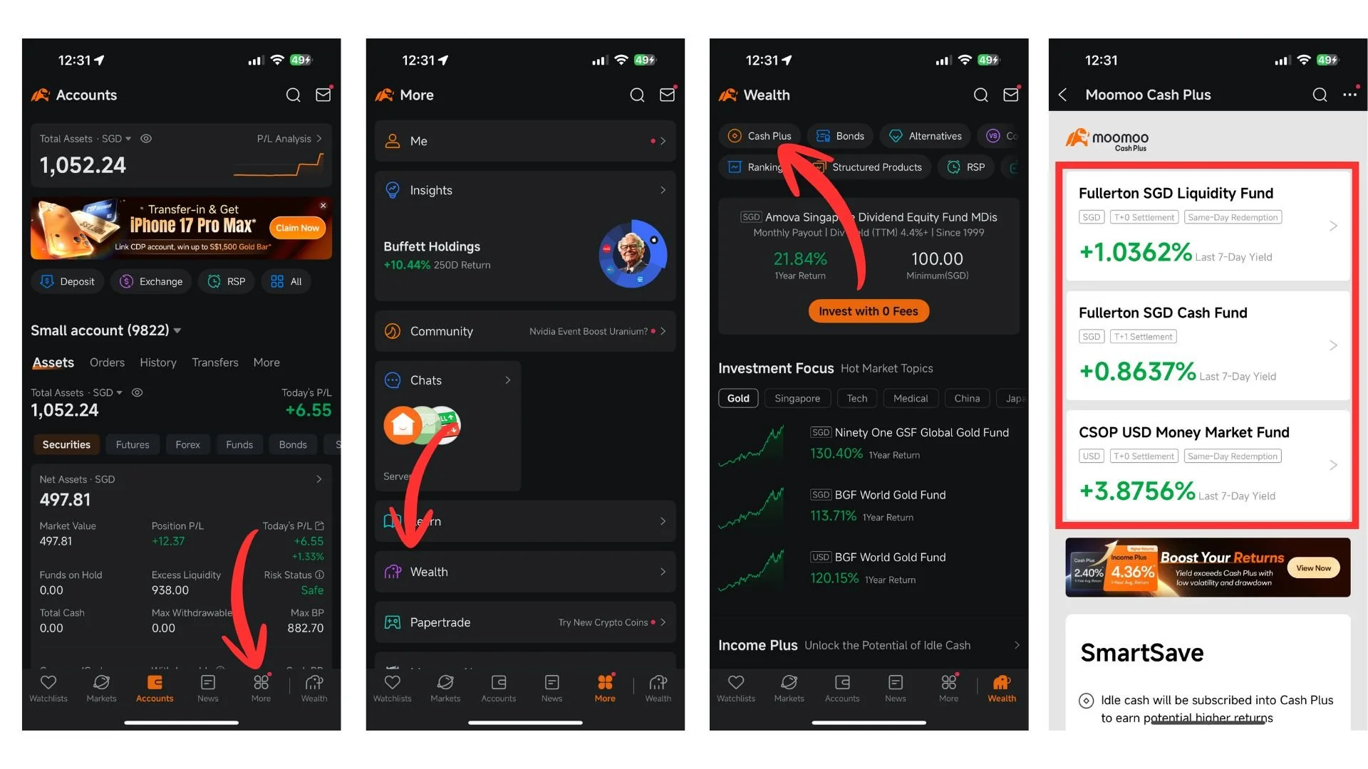 On the MooMoo main page, we will use the bottom to navigate to “More”, and then we click on “Wealth”.