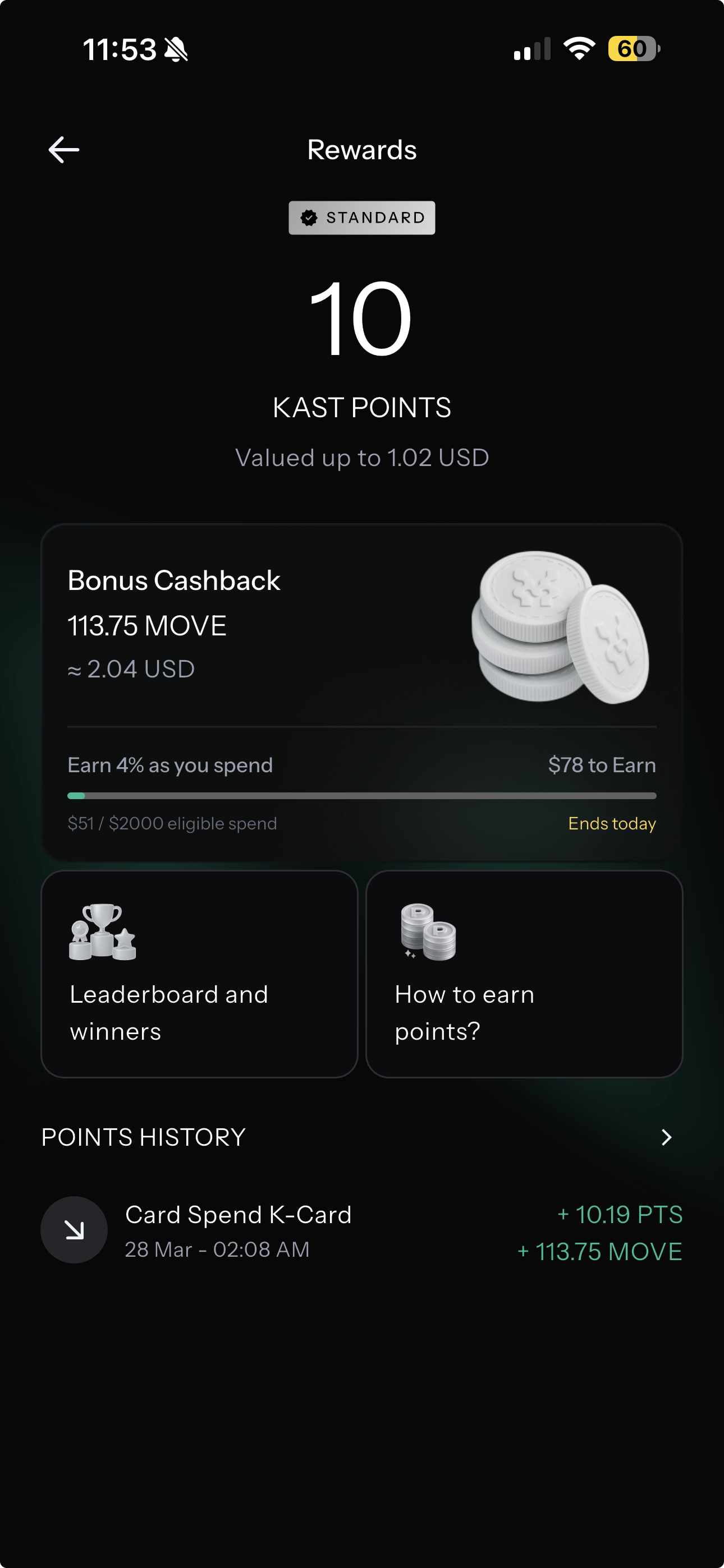 KAST gave me 113.75 MOVE tokens worth roughly $2.04, plus 10.19 KAST Points worth approximately $1.02 — on a $50.96 spend. That's about $3.06 back, or 6% effective cashback. Even after the 1.6% FX drag, I'm netting around +4.4% on that transaction.