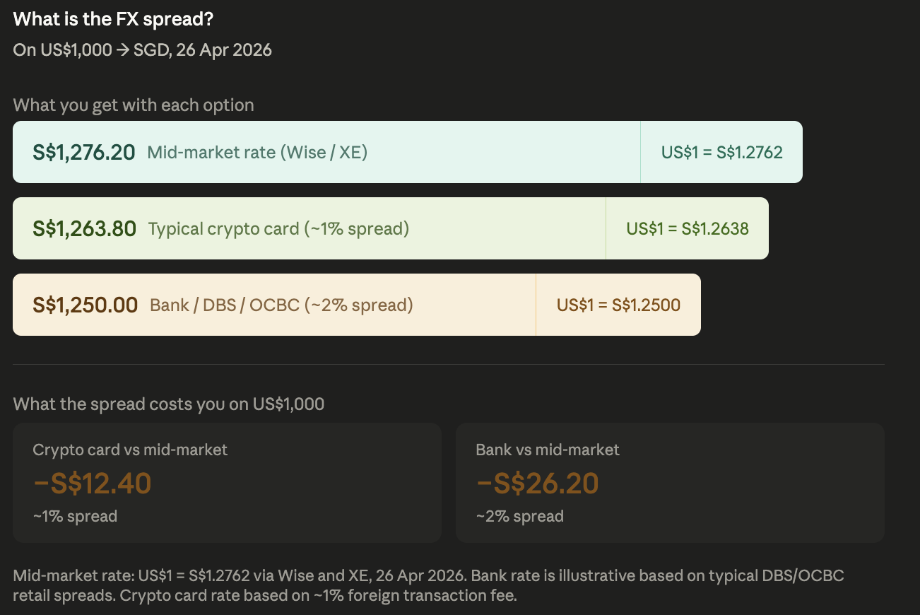 If you're in Singapore, holding USDC on-chain, and wondering which crypto card to bring on your next trip, this is the data I wish I had before I left.