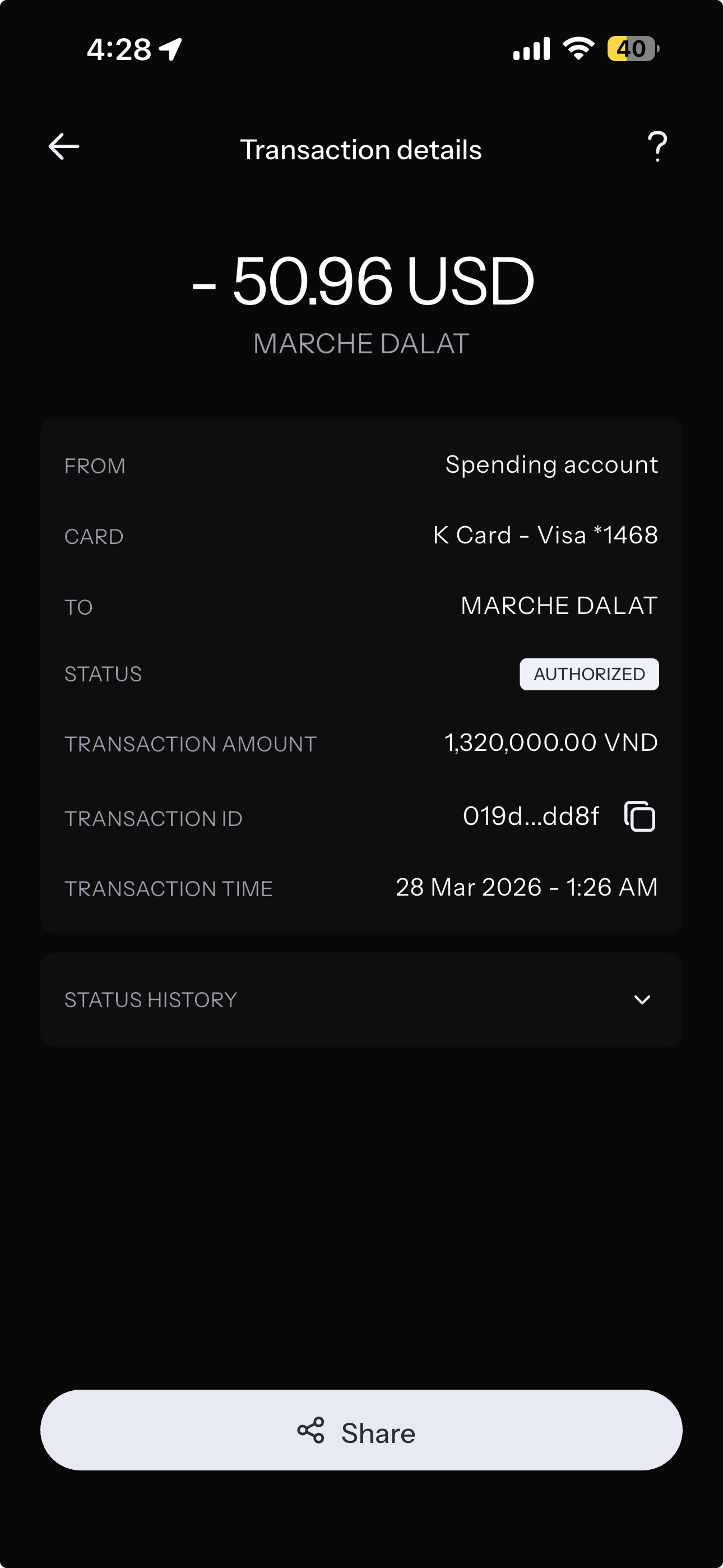 KAST I tested separately, my friend and I went to a bar in Dalat. Bought some drinks which came up to ₫1,320,000. KAST charged $50.96. That implies ₫25,907 per dollar, compared with a mid-market of about ₫26,328. Spread of roughly 1.6%, which lines up with KAST's published foreign transaction fee range of 0.5–1.75%, depending on your card tier.