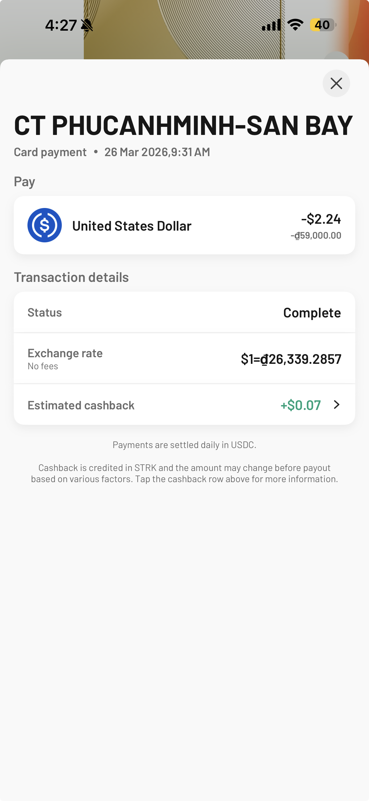 Ready charged me 2.24 USDC, and working backwards, that's an effective rate of ₫26,339 — basically spot on mid-market. No foreign transaction fee, no spread worth mentioning. That's a clean result.